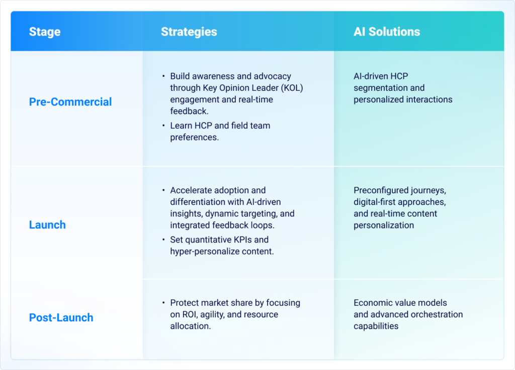 As outlined, AI drives value for brand teams in three areas: it personalizes HCP journeys and content, advances HCP adoption strategies, and offers tools for real-time strategy refinement. Here are practical examples of how brands have used AI throughout the product lifecycle to achieve these objectives: