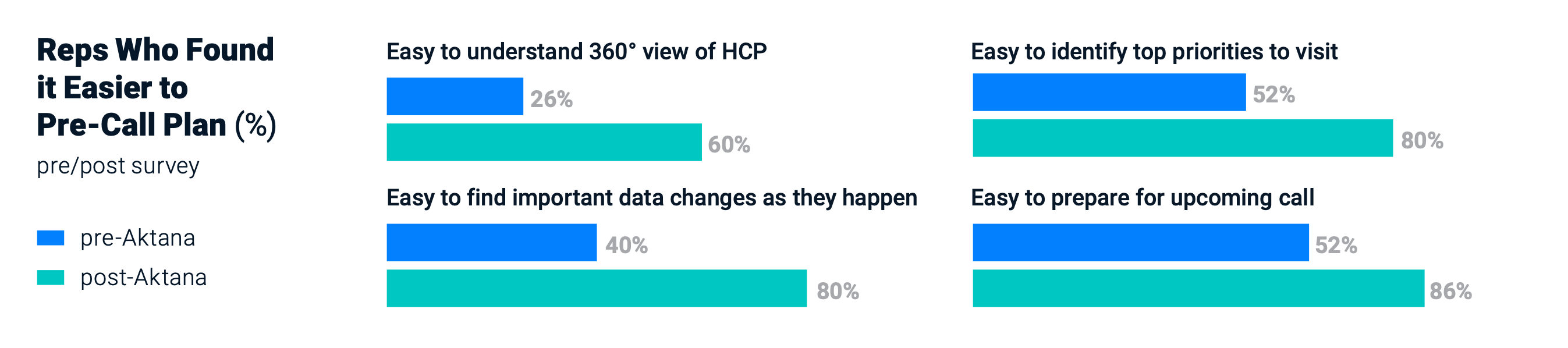 Reps who used Aktana found it easier to identify high-impact information and prep for upcoming calls in less time with better results.