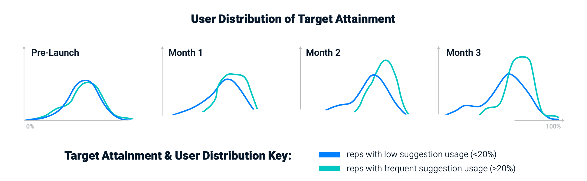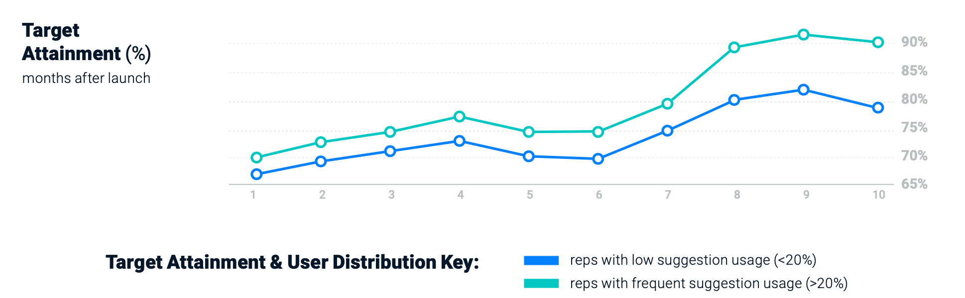 Although both groups began at the same performance level, reps who used Aktana suggestions and insights more than 20% of the time achieved greater and more consistent goal attainment.