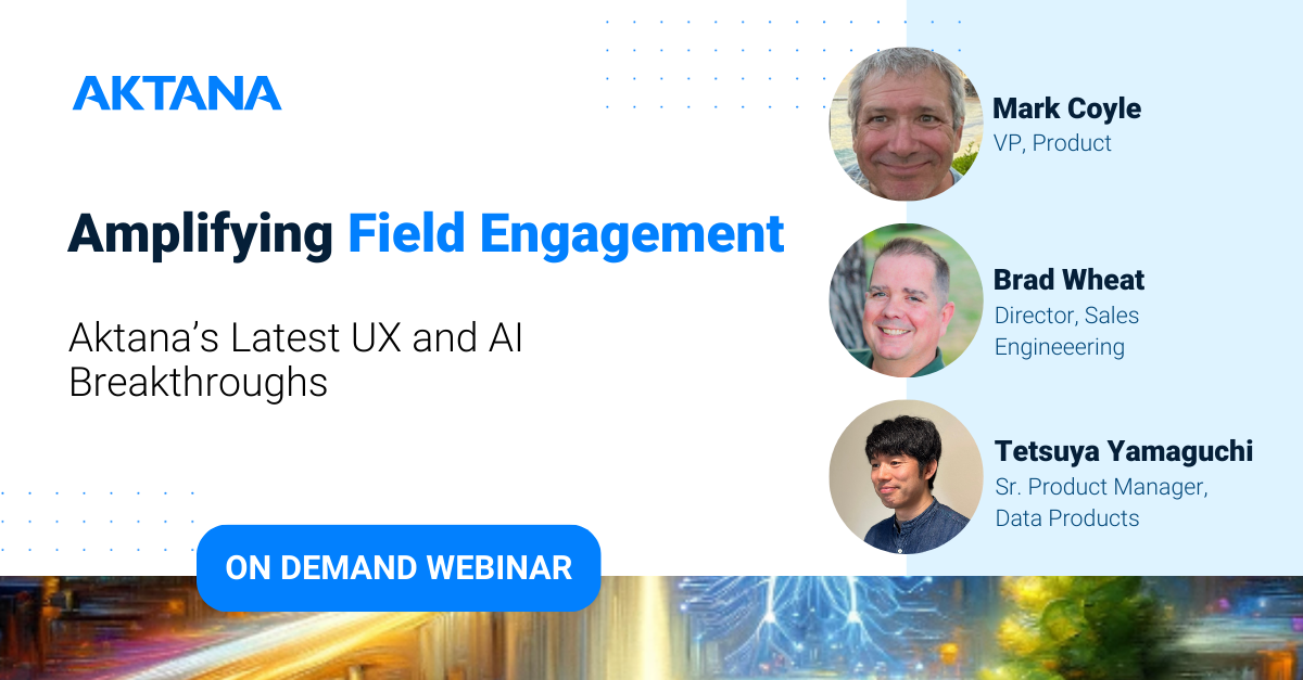 Discover how to elevate field engagement to new heights in the next installment of our Aktana Omnichannel Innovation Series. Our experts, Mark Coyle (VP of Product Management), Tetsuya Yamaguchi (Senior Product Manager for Data Products), and Brad Wheat (Director of Sales Engineering) dive deep into the future of field engagement and how the latest UX and AI breakthroughs ensure the adoption of next best actions.